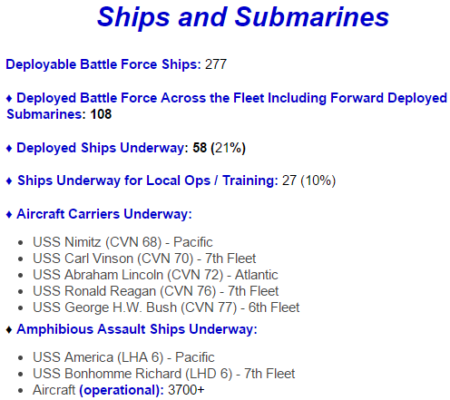 Note that the 7th Fleet and Pacific areas of operation are effectively interchangeable. And while the Carl Vinson group is now heading home to San Diego, the Ronald Reagan and Nimitz groups are early in their seven-month deployments.
