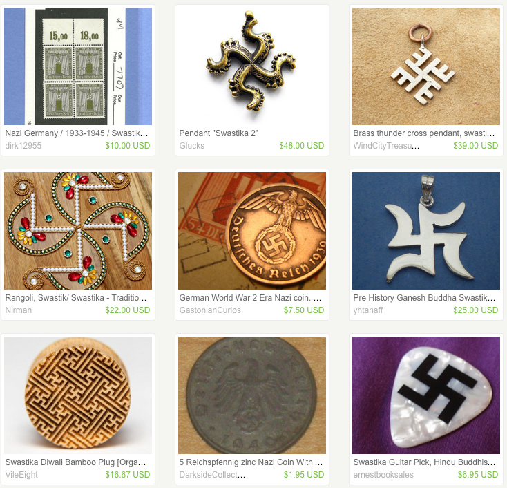 “Etsy currently offers [453] different items featuring swastikas, including 63 swastika pendants and necklaces,” conservative blogger Jeanine Martin wrote in a recent post. “So, I can’t buy a Redskins’ pendant on Etsy but I have my choice of swastika pendants. Wonderful. Political Correctness hypocrisy at its finest.”
