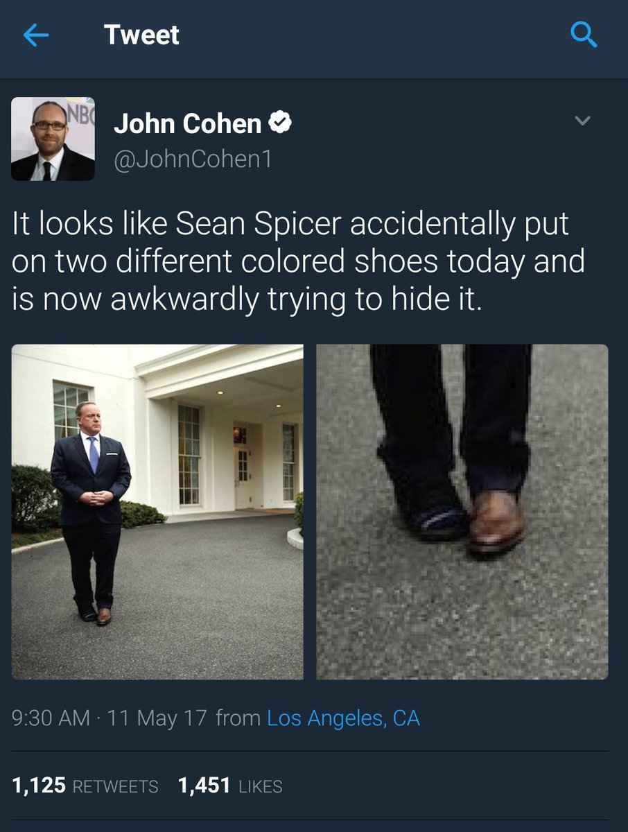 “It looks like [White House press secretary] Sean Spicer accidentally put on two different colored shoes today and is now awkwardly trying to hide it,”