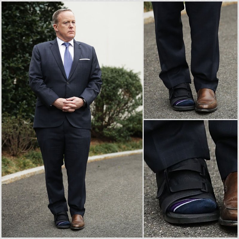 Secondly, Spicer isn’t wearing two different shoes. He’s wearing a boot because he has a bum ankle.