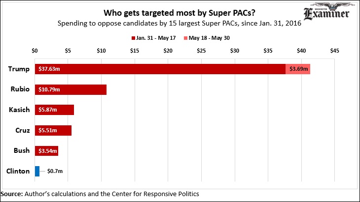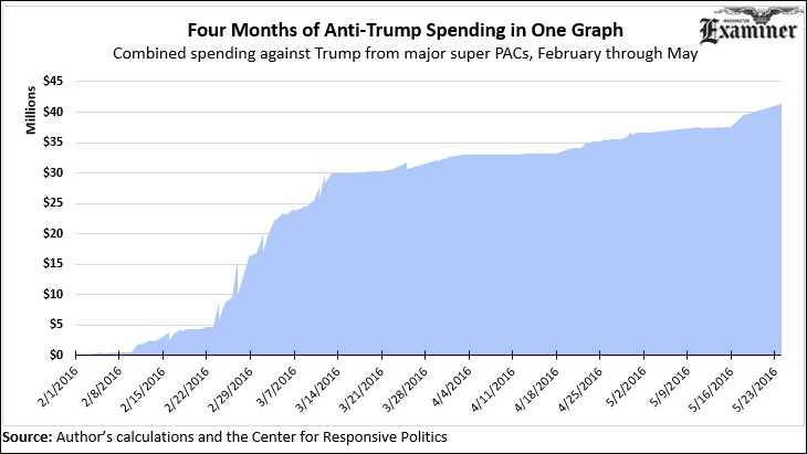 Anti-Trump spending passed the $40 million mark on May 24, when Priorities USA Action (a pro-Hillary Clinton super PAC) spent $1.7 million on a TV ad buy against the presumptive GOP nominee. The week prior, Priorities USA Action spent $2 million on a separate ad buy.