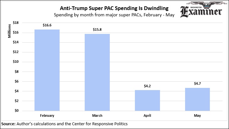 More than three-quarters of every dollar spent against Trump in the last four months came in February and March. Since then, the spending has dwindled, but the millions spent by Priorities USA Action in May pushed spending above the April total. Super PAC spending should eventually pick up again and peak in October, although it’s not clear if that peak will surpass the monthly spending totals from the busiest parts of the GOP primary.