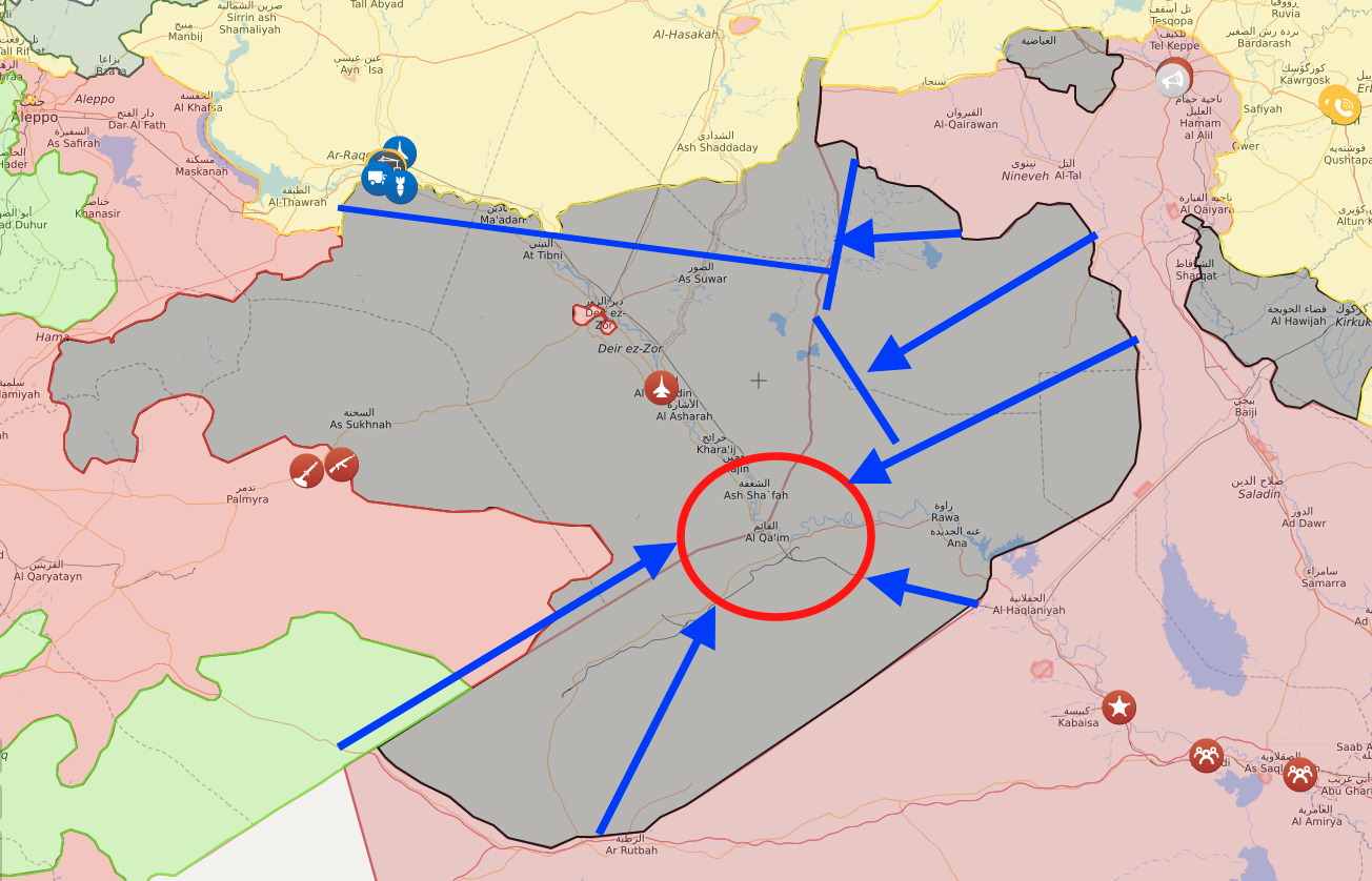Moreover, the starting point of the most westward blue arrow (just across the Syrian border) illustrates the U.S. and allied special operations forces garrison at At-Tanf. As I’ve explained, that position gives the U.S. great opportunity to push through the Syrian desert against Al Qa’im’s southern flank.
