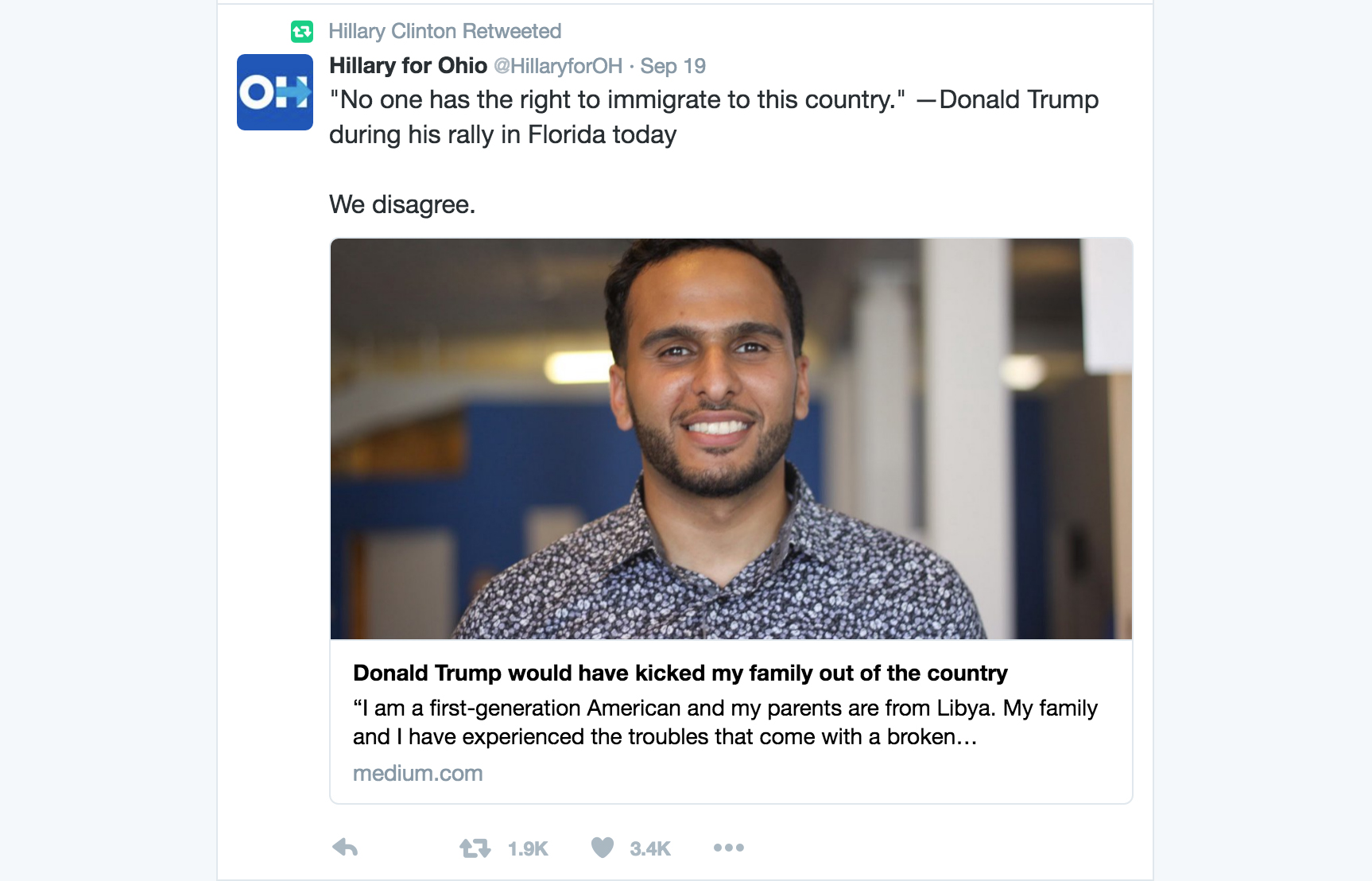 On Monday, the Clinton Ohio campaign tweeted Mohamed G.’s picture with Trump’s quote, “No one has the right to immigrate to this country.” The campaign added the comment: “We disagree.”