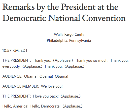 From the July 28, 2016, White House transcript of former President Barack Obama’s address at the Democratic National Convention: