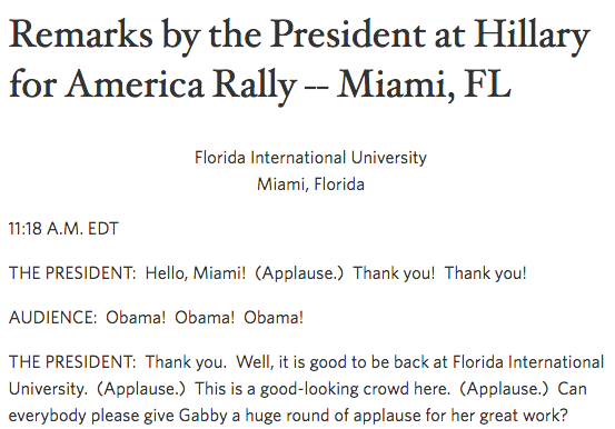 From the Nov. 3, 2016, White House transcript of Obama’s address at a rally in Miami: