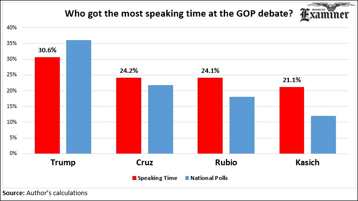 With four people in the debate, Trump spoke for nearly one-third of the time, well more than his fair share. Cruz and Rubio had about one-fourth, while Kasich had just over one-fifth.