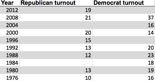 That enormous increase in Democratic turnout, generated in part by the Obama and Clinton organizations but also representing spontaneous enthusiasm and interest, was a leading indicator of the Democratic victory in November. The limp Republican turnout in 2012, slightly down not only from 2008 but from 2000, was a leading indicator of the failure of the Republican national ticket in the fall to generate enough turnout to win (Obama got 3.5 million fewer votes in 2012 than 2008, but Mitt Romney got only 1 million more votes than John McCain).