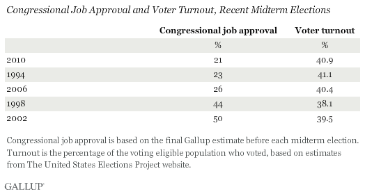 “In the last five midterm elections, voter turnout has exceeded 40 percent when Congress’ approval rating was low, but turnout was below 40 percent when Americans were more approving,” the polling firm reported.