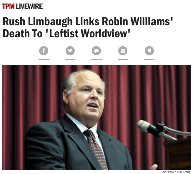 Several news organizations reported Tuesday that Limbaugh had attributed Williams’ apparent suicide to the fact that the actor held left-leaning political beliefs.
