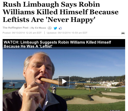 “All of these low-rent, despicable, irresponsible, pathetic, so-called media watchdogs on the left are trying to make it sound like I said that Robin Williams gave up because he was a liberal and is hopelessly doomed to misery and despair because that’s what liberals are devoted to,” Limbaugh said during his radio program.