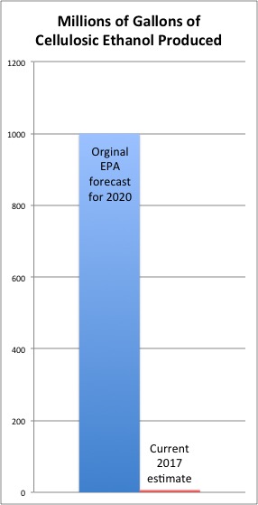 But it hasn’t panned out. Reuters reports: “The EPA predicted in 2007 that U.S. cellulosic ethanol production could hit 1 billion gallons by 2020, but output this year is expected to reach only 7 million gallons, according to Renewable Fuels Association (RFA), a trade group.”