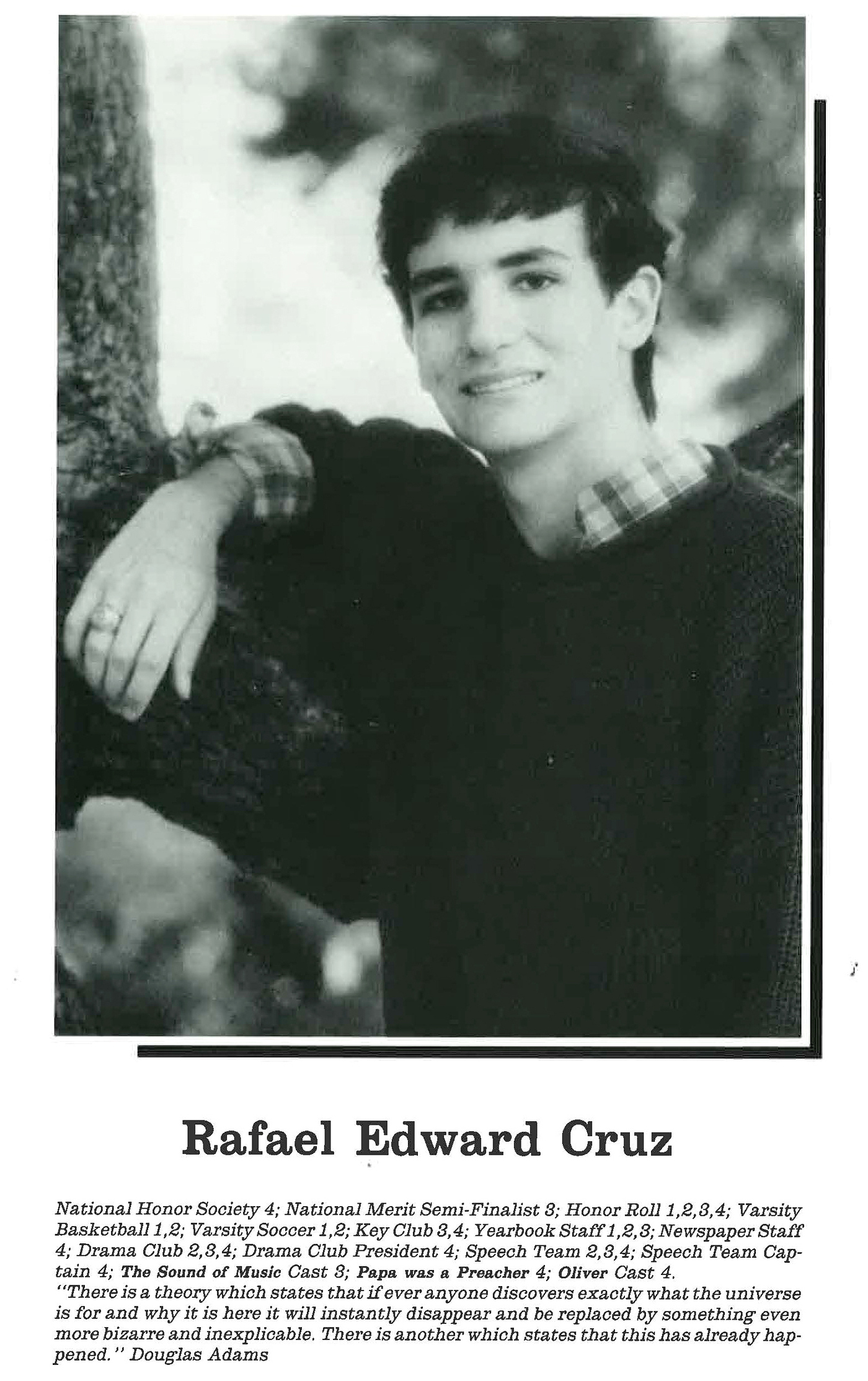 Here’s Ted Cruz in his high school yearbook. It may not surprise you that Cruz was captain of the speech team. He was also president of the drama club and a member of the cast in school musicals, including “The Sound of Music” and “Oliver.” One might guess Cruz would have quoted a Founding Father in his yearbook, but instead Cruz picked a quotation from “Hitchhiker’s Guide to the Galaxy” author Douglas Adams. (via NPR)