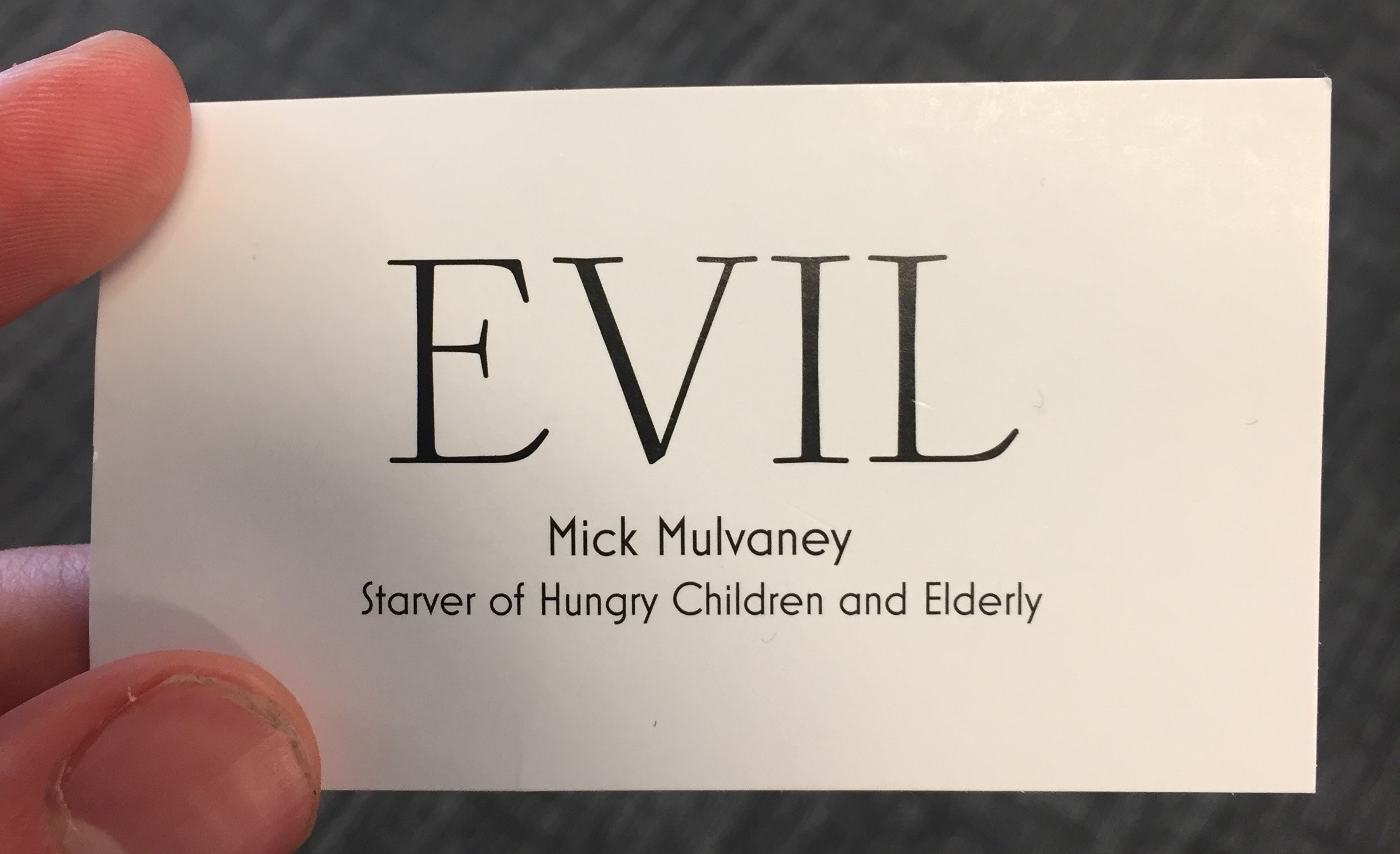 There’s another business card that Mulvaney passes out but it’s not his favorite. In big bold letters, it simply blares “EVIL,” and gives Mulvaney the title of “starver of hungry children and elderly.”