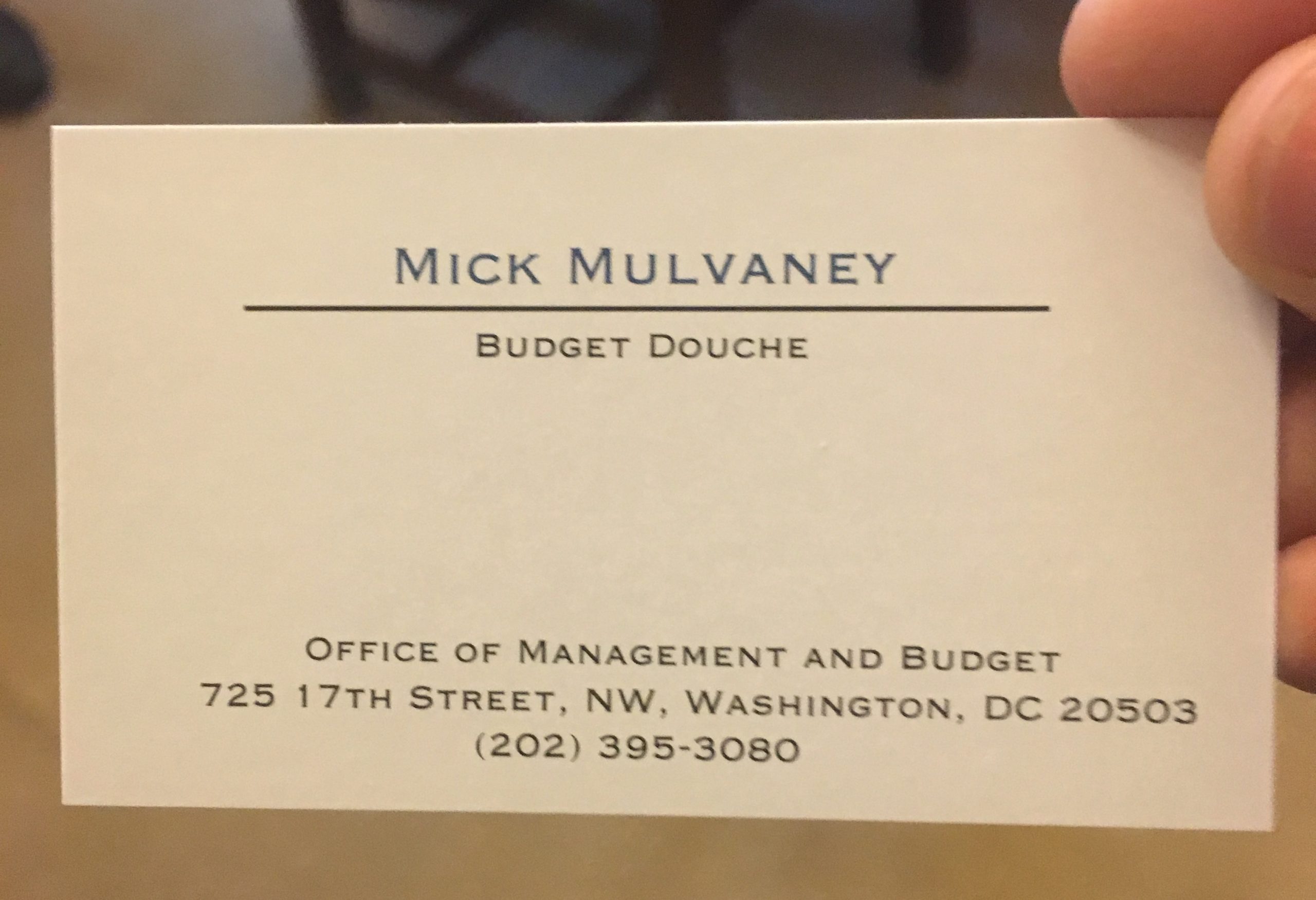 But while there’s debate over that budget (specifically whether the numbers will actually balance in a decade), there’s no question about the accuracy of Mulvaney’s information. His name, number, and address are all correct on the “douche” cards.