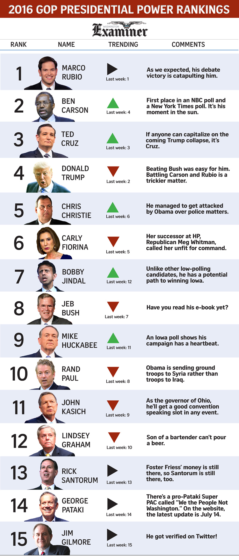 The GOP field is still at 15 strong for now, and we rank them from the most important of the gang down to Jim Gilmore.