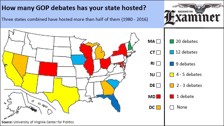 By the end of the 2016 cycle, New Hampshire will have hosted the most GOP primary debates, with 20, followed by Iowa and South Carolina with 12 each. Combined, those three states account for more than half of all the debates. Sixteen states plus Washington, D.C. have hosted a GOP debate in the past or plan to host one this primary cycle.