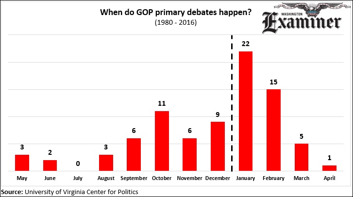 Each primary cycle seems to start earlier than the last, although August was a late start relative to the past two GOP cycles. More debates have taken place in October than in November or December, even though those months are closer to the primaries.