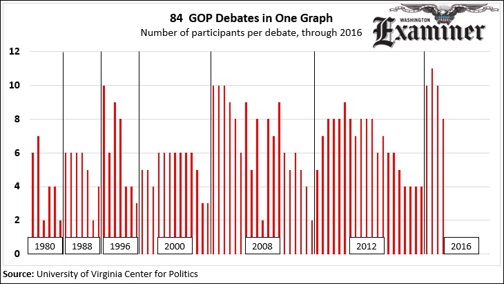 Some pundits have heavily criticized the hosting TV networks for not allowing all of the major GOP candidates to participate in their primetime debates. Tuesday’s Fox Business debate will have eight candidates on the main stage, the fewest yet in a GOP debate this primary cycle. Still, that’s well above the average of six candidates per debate from 1980 to 2016.