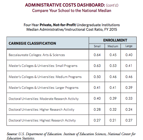Update: An earlier version of this article failed to note that the NCES does not have a formal definition for “administrative costs.” The costs described above as “general administrative services…” are what NCES calls “institutional support,” which is what ACTA’s report classified as “administrative costs.” Other organizations may have other definitions of “administrative costs” based on what’s reported under other NCES categories (such as student activities, auxiliary, etc.), but the Integrated Postsecondary Education Data System (IPEDS) does not have an “administrative cost” section per se.