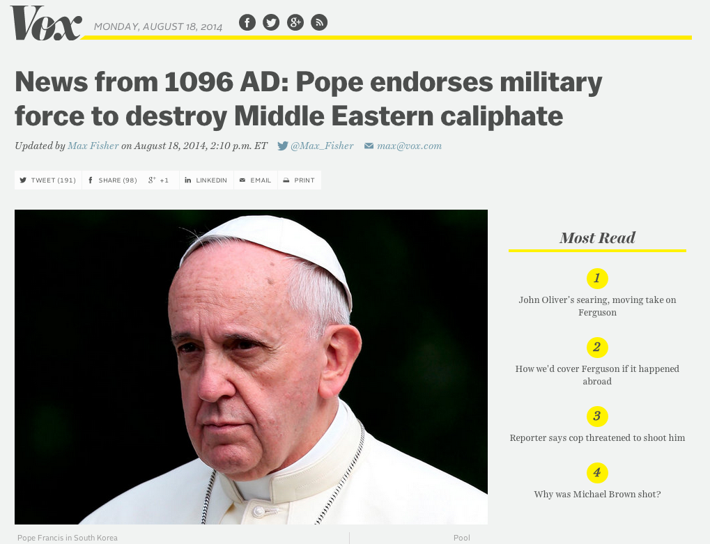 Now, although the headline is bit humorous, the body of the article is, for lack of a more polite word, idiotic. Fisher (jokingly?) accuses Pope Francis of calling for a new crusade, this time to wipe out the Islamic State, the terrorist group that has been rampaging across Iraq.