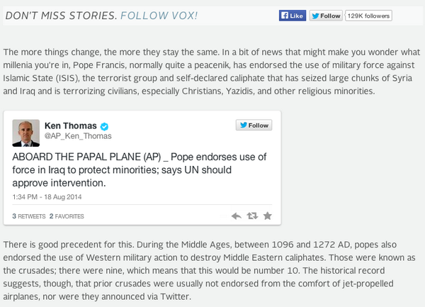 As you can see, Francis clearly didn’t call for a new crusade (I can’t believe I have to write this sentence). The Pope merely asserted his belief that all efforts must be made to stop unjust aggressors from harming the innocent, hardly a controversial position for the leader of the Roman Catholic Church.