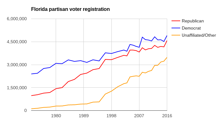 Another somewhat related note on Florida: For more than three decades leading up to 2006, Republicans in the state had been gaining ground against Democrats in the category of partisan voter registration. The Republicans’ momentum collapsed in 2008, along with the party’s fortunes, and GOP registration fell from about 93 percent to about 86 of the Democrats’ total. Only this year, using the new numbers as of December 31, have they finally regained all of the ground they had lost at the beginning of the Obama era, bringing them to within 300,000 registered voters of party parity.