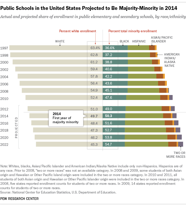 And as the number of white students has declined, the number of Hispanic and Asian students has increased, coinciding with their overall population growth. “From 1997 to 2013, the number of Hispanic children ages 5 to 17 born in the U.S. jumped 98 percent, while the group’s immigrant population of the same age declined by 26 percent. Among Asians of this age, the number of U.S.-born Asians increased 50 percent during this time, and the immigrant population increased a more modest 9 percent,” Pew reported.