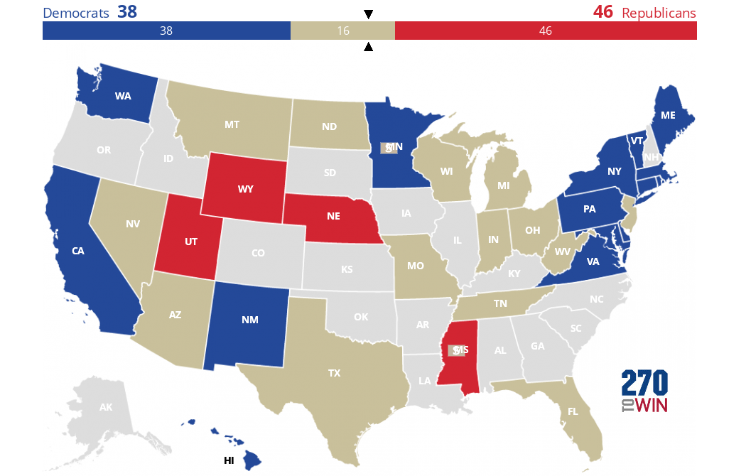 Republicans have 46 seats locked up. There are 16 potentially competitive Senate races. Republicans need to win 4 of those 16 in order to keep control of the Senate. (In a 50-50 tie, the vice president can break the tie).