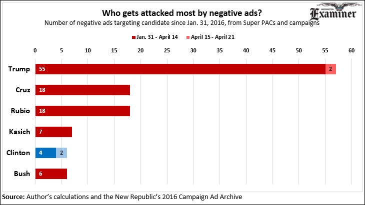 Super PACs aside, candidates are also attacking each other over the airwaves. A majority of negative campaign ads since Jan. 31, 2016 have hit Trump. Clinton has been attacked by just six different commercials portraying her negatively, and most of those came from conservative sources. The two most recent anti-Clinton ads came from the Cruz campaign and aired in Pennsylvania. The two most recent anti-Trump ads also came from Cruz, debuting on April 15 in New York and April 21 in Pennsylvania.