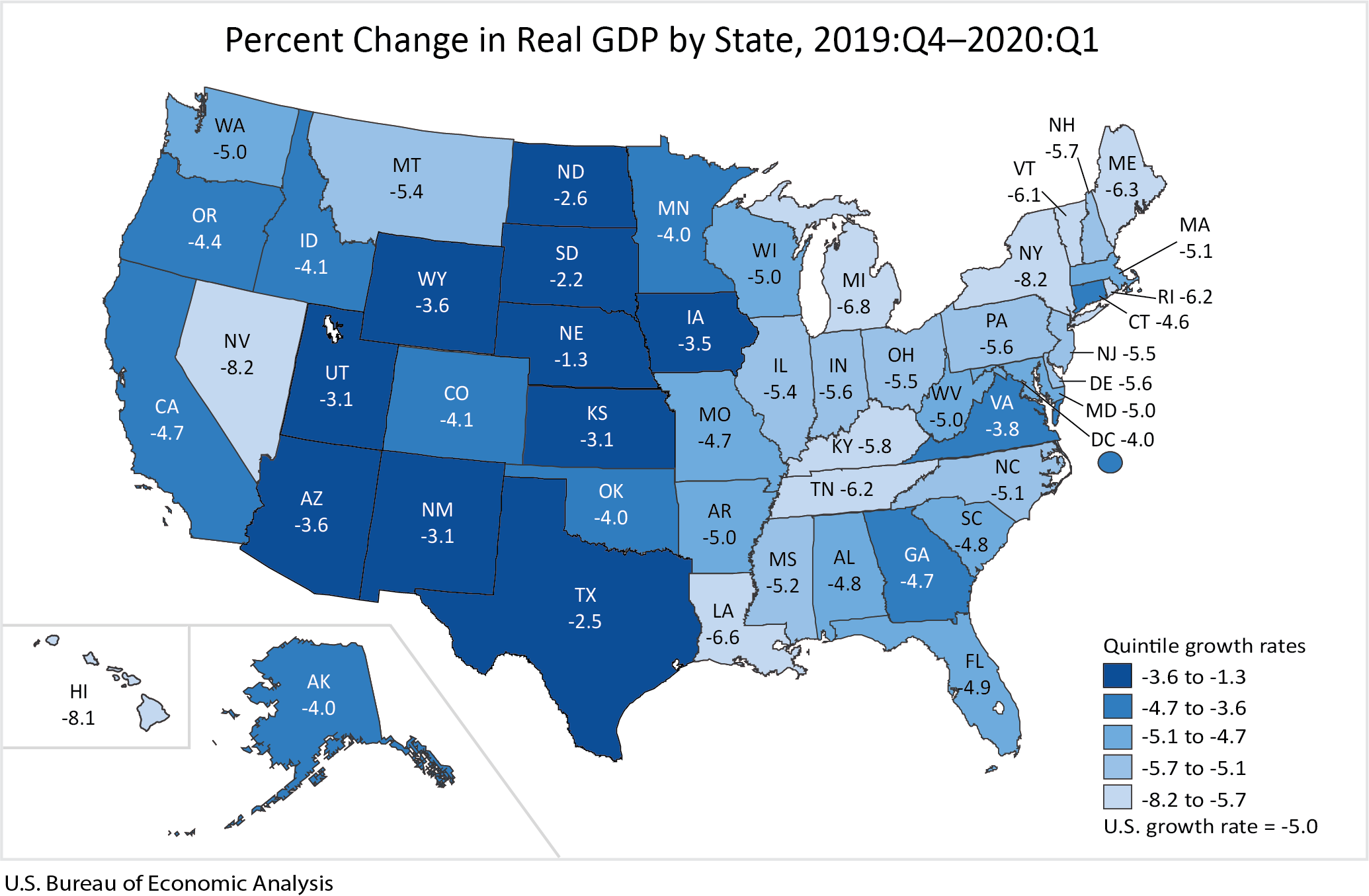 As a starting point, consider the nearby Department of Commerce rendering of 2020 first-quarter GDP growth for each of the 50 states. There is not a positive number to be seen. Even the darker-blue, higher-growth states found near the fold of the map actually just show lower negative numbers. These range from -1.3% for Nebraska to -3.6% for Wyoming and Arizona.