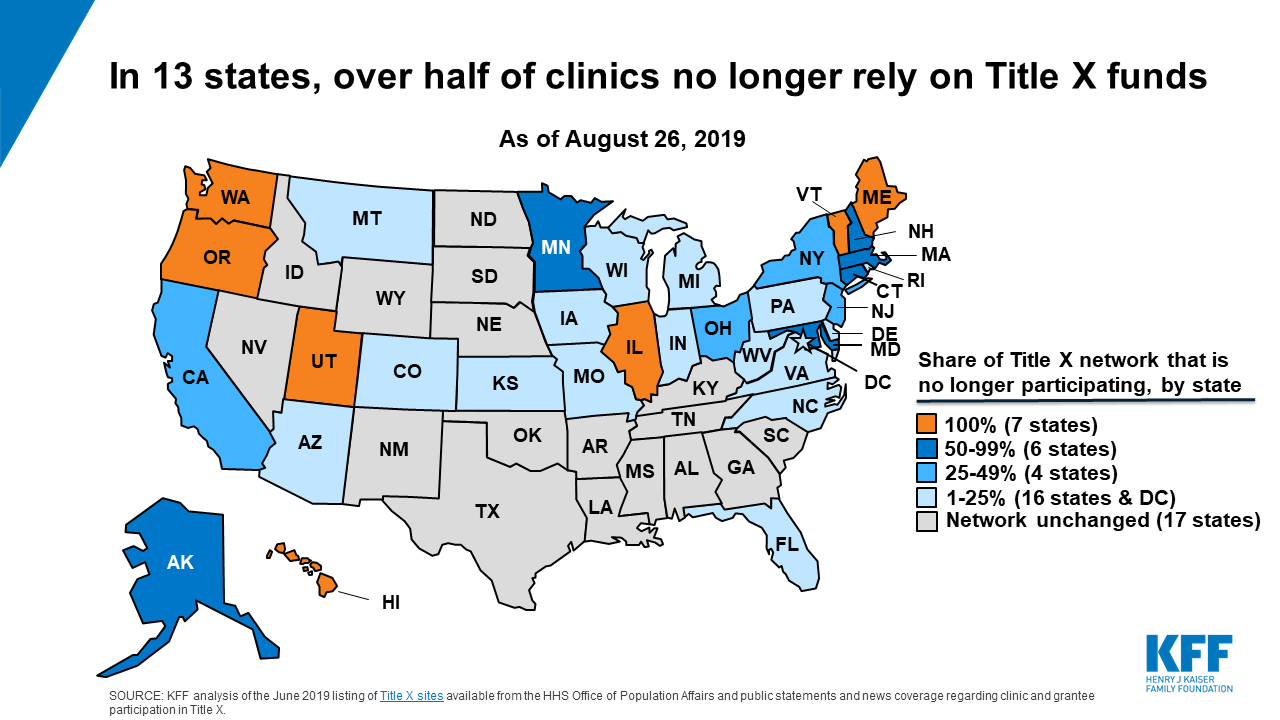 Other programs duplicate funding options for women’s family planning. In 2019, seven states were completely independent of Title X funding for family planning clinics. Six more had dropped below 50% dependence.