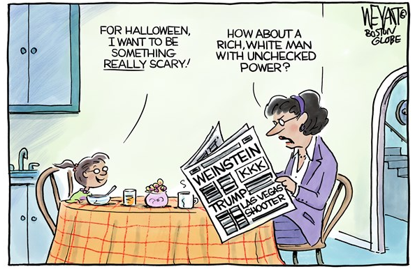 The dead giveaway that there’s a hidden meaning here is the clumsiness and crudeness of blaming of whiteness and masculinity for the world’s problems. Surely the artist intends to convey this as the convenient, cowardly way that many people are addressing the Harvey Weinstein and Hollywood sexual abuse scandals without confronting the morally unmoored, enabling, sycophantic, and hypocritical nature of an entertainment culture that still presumes to lecture us all.