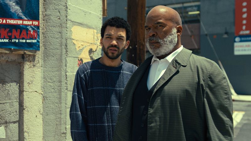 Justice Smith and David Alan Grier in the satirical movie “The American Society of the Magical Negroes.” (Courtesy of Focus Features)
