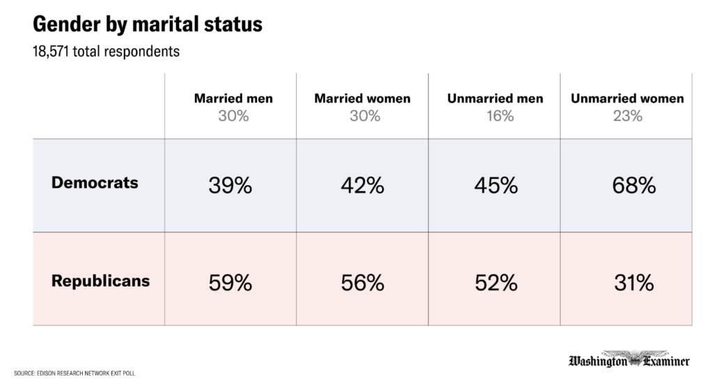 Married women actually vote Republican by a 14-point margin. Married and single men also vote Republican. It is only the Democratic Party’s overwhelming strength with single women that keeps them afloat.