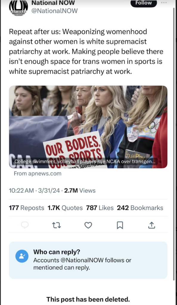 It seems the National Organization for Women’s unhinged fanaticism of transgender athletes in women’s sports was even too much for the organization’s social media team. The so-called feminist group deleted a controversial post on X from March 31. It claimed that anyone who objected to biological men who wished to identify as women and compete in sports against real women was “white supremacist patriarchy at work.”