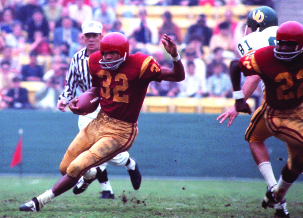 Running back O.J. Simpson #32 of the USC Trojans runs the ball against the Oregon Ducks at Autzen Stadium on November 2, 1968 in Eugene, Oregon. (Rich Clarkson / NCAA Photos via Getty Images)