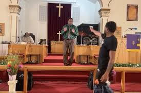 Pastor Glenn Germany said he thought Bernard Junior Polite, the young man walking toward the altar where he was standing at the lectern delivering Sunday’s sermon, was there to see his brother, who was to the right of him. (Photo courtesy of Jesus Dwelling Place Church)