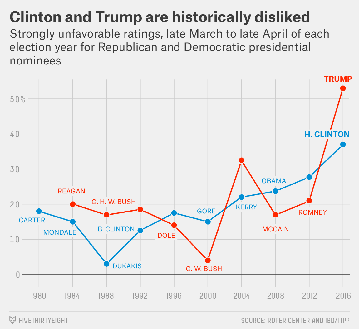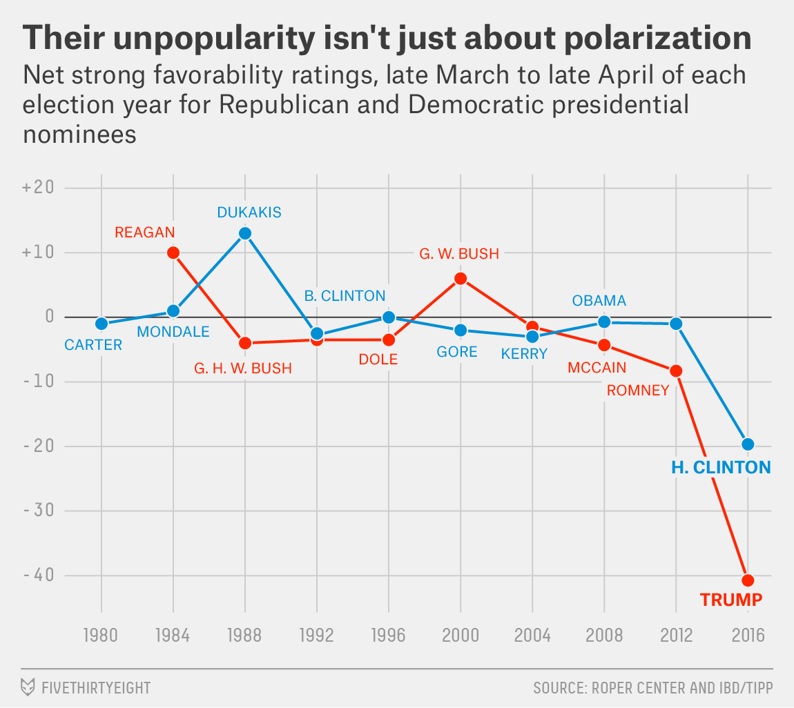 FiveThirtyEight has a great chart plotting the fact that the American people “don’t just like or dislike the candidates, they really like or dislike them.”