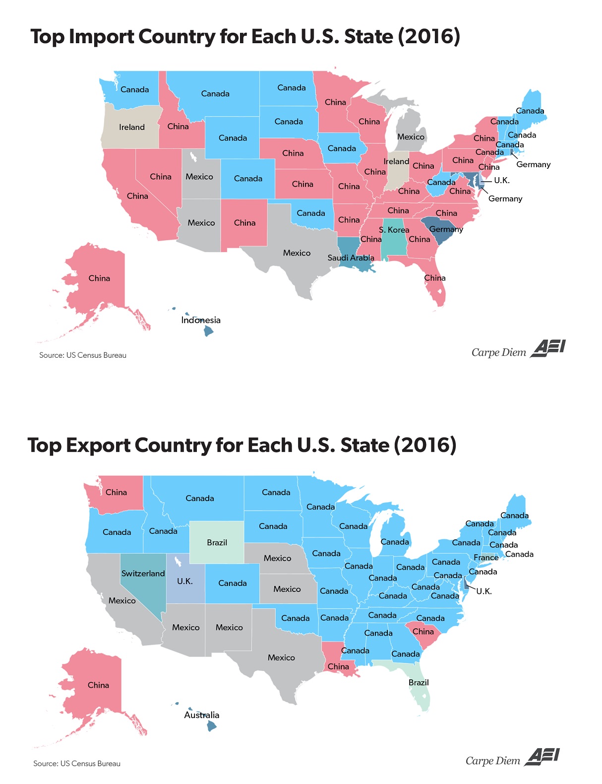 The two maps above show each state’s top country trade partners in 2016, based on the total dollar value of exports and imports from and to each state last year. More than one-third of U.S. trade took place last year with our top three trade partners – Canada, Mexico and China ($1.65 trillion in trade activity out of $4.9 trillion total trade) – and that’s why you see so much blue (Canada), grey (Mexico) and pink (China) on the maps.