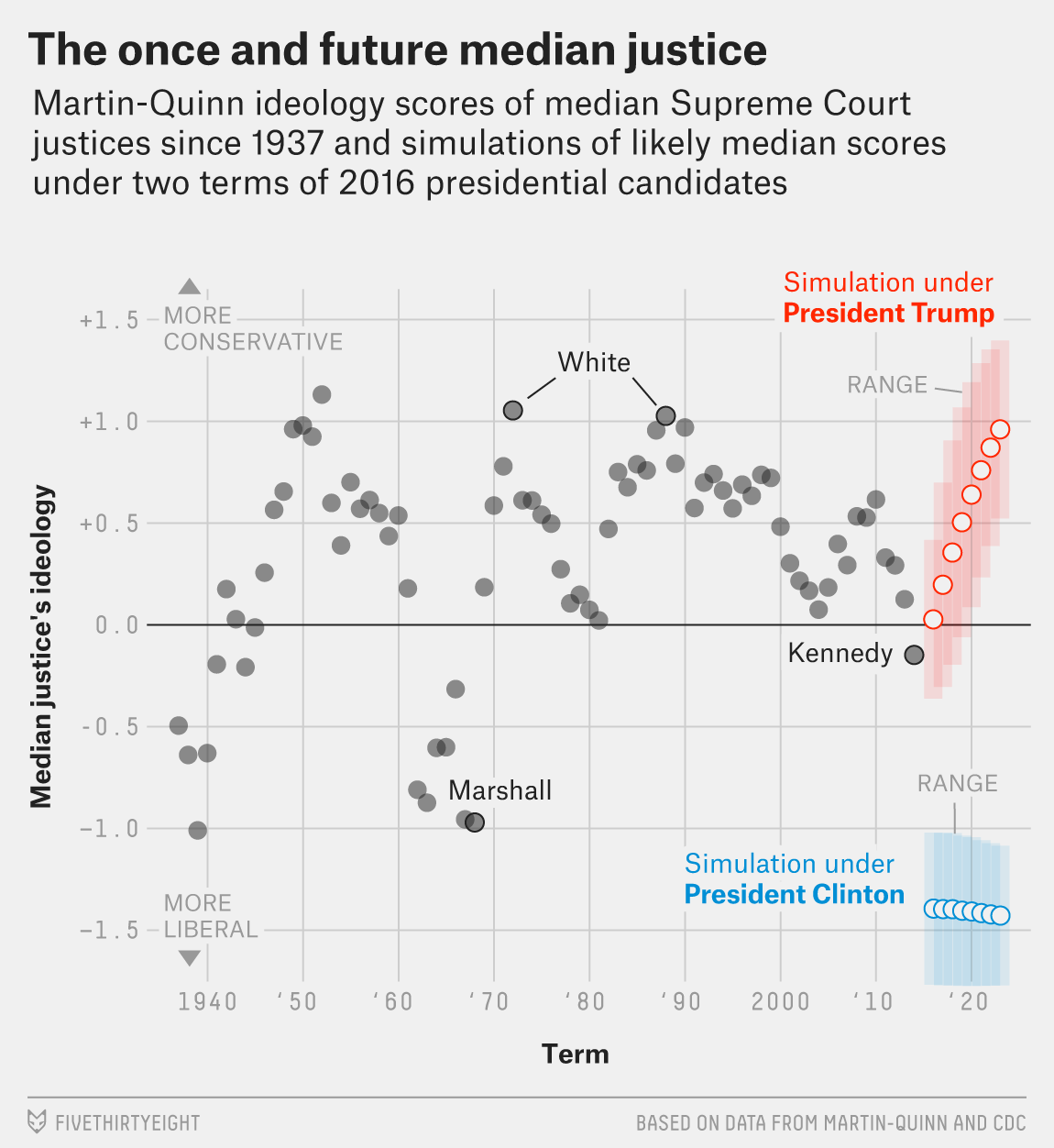 If Hillary Clinton had become president, the graph shows, the court would have immediately taken an extreme liberal turn, becoming, by far, the most liberal Supreme Court in the graph’s recorded history. If Donald Trump were to win, the graph showed the court would gradually become quite conservative, near to its most conservative point in history if Trump were to spend eight years in office.
