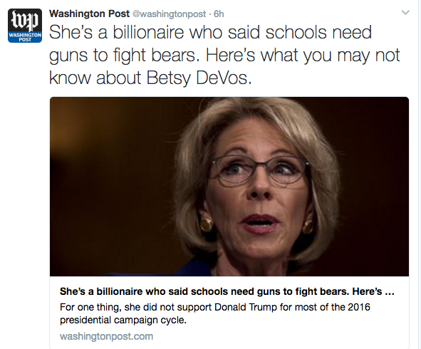 The Post’s the Answer Sheet blog published an article Tuesday titled, “She’s a billionaire who said schools need guns to fight bears. Here’s what you may not know about Betsy DeVos.”