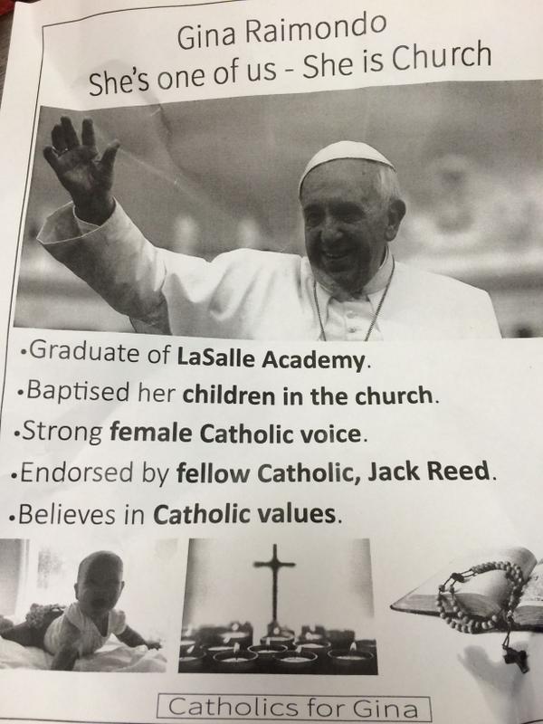 The flyer purportedly comes from a group called “Catholics for Gina,” but it does not appear to be a formal organization. Richard Thorton, director of campaign finance for the Rhode Island Board of Elections, informed the Washington Examiner that no such group is on file with his office.