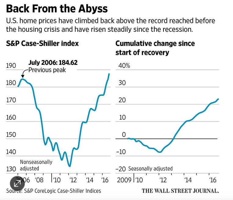 Home prices have finally returned to their highest point since the beginning of the Great Recession. It only took eight years, a trillion-dollar stimulus and massive Wall Street bailout.