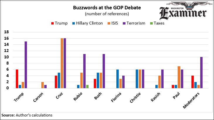 Terrorism was obviously the main subject of the GOP debate; it was raised 86 times. Each candidate said “terrorism” at least once. Ted Cruz mentioned it most with 16 mentions, followed by Trump with 15.