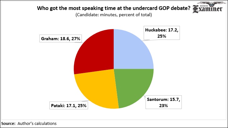 Fewer than three minutes separated the speakers with the most and least speaking time. Contrast that with the Sept. 17 undercard debate, where Lindsey Graham spoke for almost 10 more minutes more than George Pataki.