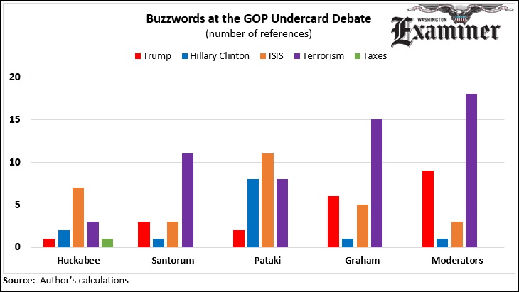 Terrorism was the main topic at the undercard debate, mentioned 55 times. Moderators brought it up most often with 18 mentions, followed by Graham with 15.