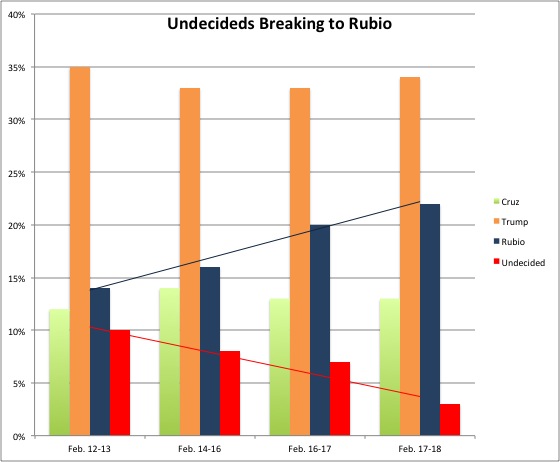 Look at this ARG tracking poll, and you see a trend: each day, more voters decide, and the generally pick Rubio.