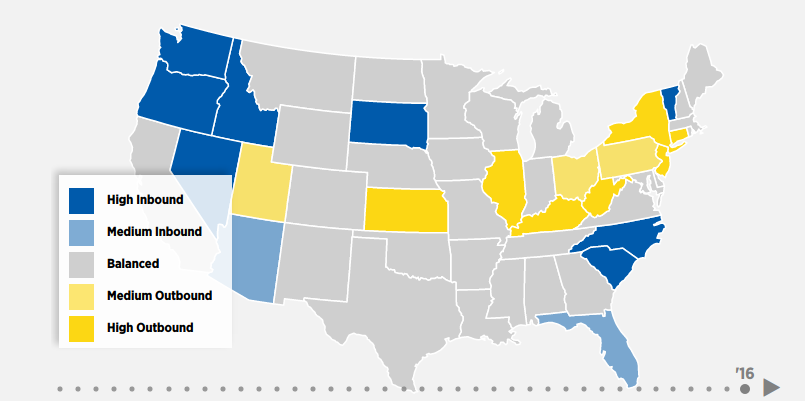 Meanwhile, United’s clients in New York, Illinois and New Jersey are the most eager to leave, but Washington D.C., at 58 percent inbound, remains a big destination for movers.