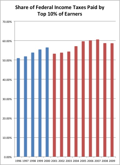 The wealthiest 10 percent got a big tax cut, but their share of the federal income tax burden increased after Bush’s tax cut, as you see in the chart below.